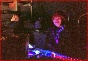 照明・音響さんの座るブースでのお二人。抜群に仲良し。お互い助け合ってます。